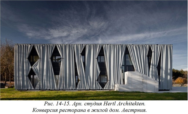Но еще большее сходство между одеждой человека и одеждой архитектуры появляется в связи с использованием тканых материалов не только в интерьере, но и в экстерьере. Так, превращая ресторан в двухквартирный жилой дом, австрийские архитекторы студии Хертл использовали в экстерьере типично интерьерный приём – задрапировав фасады с внешней стороны специальной тканью (Рис. 14–15).