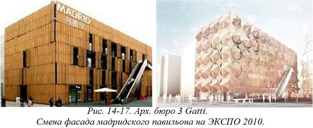 Похоже на то, что тканевые фасады уже переходят из области соляристских мутаций в сферу реальной архитектуры. Доказательство тому – павильон Эстонии на всемирной выставке EXPO 2010 в Шанхае. Еще более убедительный пример фасада-одежды демонстрирует история другого павильона на той же выставке – мадридского. Поначалу его фасады были покрыты бамбуковыми жалюзи на складных стальных рамах. За два с лишним года эксплуатации эта архитектурная одежда «поизносилась» и ее решили заменить на новую, другого «фасона» (Рис. 14–17).