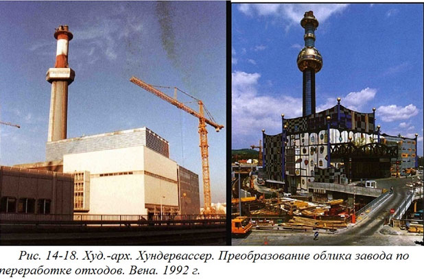 Кроме применения одежды, надеваемой на здание, есть еще один метод существенного видоизменения внешнего облика архитектуры. И огромный вклад в развитие этого метода внёс австрийский художник-архитектор Ф. Хундервассер. Сам он неоднократно заявлял, что считает себя архитектурным врачом, занимающимся «вылечиванием» существующих, безобразных, зданий. Эту формулировку я бы уточнил. Он занимался не лечением больной архитектуры, а преображением её внешнего облика. Это аналогично тому, что делают пластические хирурги. По сути дела Хундертвассер – самый настоящий архитектурный пластический хирург.