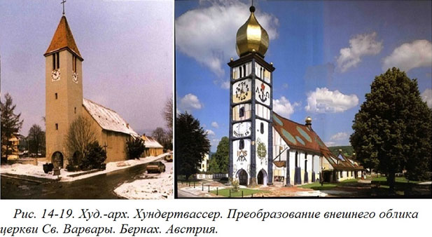 По его проектам улучшен общий вид большого количества архитектурных объектов в разных странах. Но будучи специалистом экстра класса Хундертвассер своими работами выходил на самый высокий профессиональный уровень – философский, мировоззренческий. И в этом отношении особенно показателен его проект преобразования церкви Св. Варвары (Рис. 14–19).