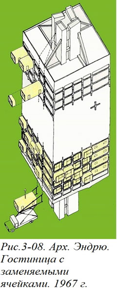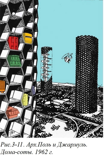 С этой точки зрения еще более наглядным был проект, который разработали архитекторы Поль и Джармуль[3-10]. Они изобразили многоэтажные жилые дома, состоящие из сотообразной несущей конструкции, внутри которой вставлены фактически односемейные жилые дома. Каждая ячейка сот стала по сути дела индивидуальным участком, на котором стоит отдельный небольшой дом. Основное достоинство этого проекта заключалось в том, что авторы не только сами поняли, но и наглядно показали графически, что в подобной архитектурной ситуации располагаемые на несущей конструкции индивидуальные жилища могут (да и должны) быть не просто разными по размеру, а отличаться друг от друга по образу, по стилистике, по сроку службы.
