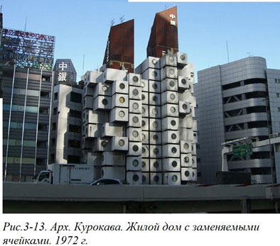 Но идеи продолжали пробиваться в реальную жизнь. В 1972 году в Токио появилось многоэтажное сооружение, представляющее собой несущую конструкцию из двух железобетонных пилонов, на которыенавешаны 140 объемных блоков (Рис. 3–13). Правда, этот дом не совсем жилой, скорее разновидность гостиницы. Все жилые ячейки сделаны одинаковыми и очень маленького размера – всего по 10 м2, включая душ и несколько шкафов.
