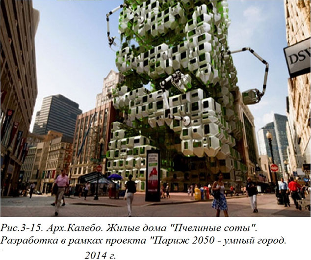 То, что реальное строительство порождает вынужденные отклонения от «теоретически чистых» новаторских идей, вполне объяснимо. Казалось бы, ясно, что каждый раз целесообразно используя полезные находки, увиденные в отдельных архитектурных задумках, нужно не повторять их, а двигаться дальше. Однако зачастую даже спустя десятилетия некоторые вполне простительные «недодумки» предшественников продолжают повторяться даже в работах, претендующих на перспективу. К примеру, в предложении жилых домов архитектора В. Калебо навесные жилые ячейки изображены вплотную друг к другу и без какого-либо их многообразия по внешнему виду (Рис. 3–15), А ведь это работа 2014 года![3-12]