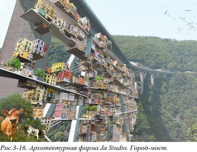 А в проекте города-моста, использующем дорогу между Салерно и Реджио Калабрия хотя и разделили сооружение на несущую конструкцию и наполнение, но нарисованные ими жилища как бы построены в одно время и не похоже, что их можно будет со со временем заменять (Рис. 3–16).