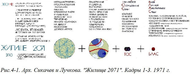 И в том же духе сочинили несколько других решительных лозунгов. А завершили первый кадр своеобразным резюме: «Жилище 2071 – ЭТО пересмотр самих понятий дом, квартира, автомобиль, мебель». Сейчас этот декларативный первый кадр нашей работы следует признать достаточно удачным как по содержанию, так и по форме (хотя и явно резкой). Можно считать, что он выдержал экзамен времени. А следующие два кадра раскрывали более подробно его содержание.