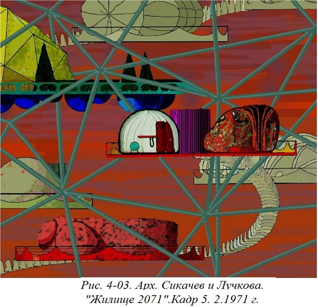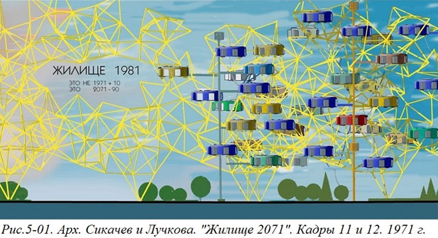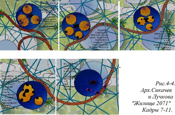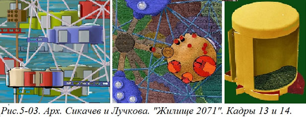 Этими кадрами заканчивалась первая половина («первая глава») нашей работы «Жилище 2071» и именно эта часть вызвала наиболее яростные возражения. Сейчас, спустя полвека, очень поучительно читать сохранившиеся тексты рецензий на нашу работу, особенно если не забывать, что писались они не профанами, далекими от архитектуры и дизайна, а высоко-квалифицированными специалистами.