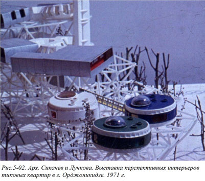 Спустя полгода мы попытались применить нечто похожее в проекте выставки перспективных интерьеров квартир в городе Орджоникидзе (Рис. 5–02). Квартиры-экспонаты мы как бы вынули из типового жилого здания и разместили в виде автономных объемных блоков на несущей конструкции. А в добавление на той же конструкции разместили несколько объемных блоков совсем другого рода – в развитие идей нашей предыдущей работы «Жилище 2071». Честно говоря, мы пытались обмануть и под видом вполне сиюминутной темы нелегально протащить некоторые из своих идей, совсем другого характера.