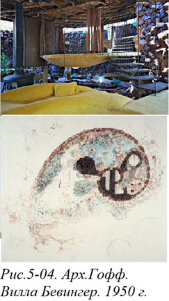 Идея «комната в комнате» – не наше изобретение. Ее зачатки (всего лишь зачатки, но еще не создание) можно увидеть в вилле Бэвингер, построенной в начале 1950-х годов по проекту выдающегося американского архитектора Брюса Гоффа. В этом доме отсутствовали комнаты в привычном понимании. (Рис. 5–04). Интерьер виллы представлял собой единое спиралеобразное пространство, развивающееся вокруг мощного центрального железобетонного столба. От этого столба на разных уровнях отходят консоли, к которым закреплены своеобразные внутренние балконы. Один из них представляет собой большую круглую кровать, причем размер балкона равен размеру кровати, то есть пола у этой «комнаты» попросту нет. А вместо стен было предусмотрено мягкое сетчатое закрытие. Подобный архитектурный феномен можно рассматривать либо как комнату, превратившуюся в мебель, либо наоборот, как мебель, превратившуюся в комнату.