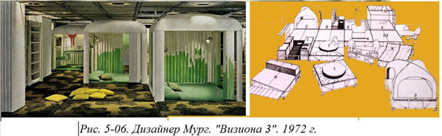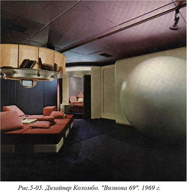 Но подлинным «отцом» идеи жилого пространства по типу «комната в комнате» следует считать итальянского дизайнера Дж. Коломбо, создавшего свою знаменитую «Визиону 69». По заказу немецкого концерна Байер (занимающегося материалами типа пластмасс) дизайнер создал выставочный интерьер без наружных стен (Рис. 5–05).