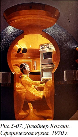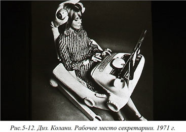 Уже в те годы появилось несколько «мутационных» дизайнерских разработок, развивающих идею предметов, постоянно сопровождающих человека. Так, Л. Колани показал натурный образец рабочего места секретарши, где всё оборудование и человек буквально сливаются в некий гибрид человека и предметов (Рис. 5–12)