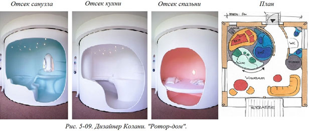 Интерьер дома представляет собой единое пространство со вставленным в него вращающимся цилиндром, который содержит в себе несколько отсеков: спальню, кухню и ванную. Цилиндр можно вращать с помощью пульта дистанционного управления, выбирая необходимую в данный момент комнату. Отсюда и название «Ротор Дом» (Рис. 5–09).