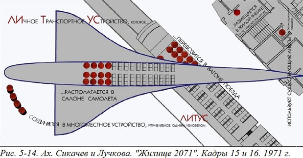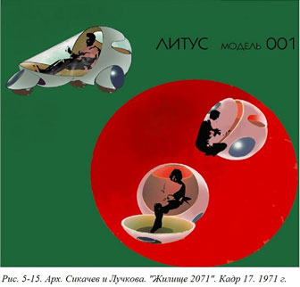 Эти два кадра излагали в визуальной и частично словесной форме наши представления о возможности качественного пересмотра (по сути дела мутациях) некоторых объектов, связанных с проблемой передвижения человека в современной среде, в значительной степени изуродованной людьми (в том числе в немалой степени архитекторами и дизайнерами). Предлагаемое нами гипотетическое устройство мы назвали ЛИТУС (ЛИчное Транспортное УСтройство). Мы умышленно не использовали слово «автомобиль». Слова обладают психологической силой, нередко вредной для генерирования творческих решений. Привычное слово неизбежно толкает на привычные, тривиальные решения. А мы всей своей работой пытались наметить возможные пути для подлинно качественных, а не просто количественных архитектурных и дизайнерских изменений. Тогда, в 1971 году мы еще не могли знать чрезвычайно ценные мысли Г. С. Альтшуллера по той простой причине, что первая его книга вышла из печати несколько лет позднее. Но чисто интуитивно мы поступили именно по Альшуллеру. Кадры 15 и 16 нашей работы по сути дела и были Идеальным Конечным Результатом. Мы не пытались нарисовать конкретные формы предлагаемого нами объекта, а лишь перечислили (в остаточно абстрактной форме) свойства, которыми он, по нашему мнению, должен обладать. Так, он должен при необходимости размещаться непосредственно в жилой ячейке. Если жилище многоэтажное, то должен как-то помещаться в лифте. Покинув жилище несколько Литусов должны уметь соединяться в единое транспортное устройство, управляемое всего лишь одним человеком. Нужно, чтобы его можно было размещать в железнодорожном транспорте и даже в самолете. На следующем, 17 кадре мы по сути дела повторили часть этих тезисов, но не словесным, а чисто визуальным языком, причем не в конкретной, а чисто образной форме (Рис. 5–15). И, наконец, на последнем, 18 кадре, мы изобразили интерьер жилой ячейки, наполненный различными гипотетическими образами объектов, предложенных нами в разных частях работы «Жилище 2071» (Рис. 5–16).