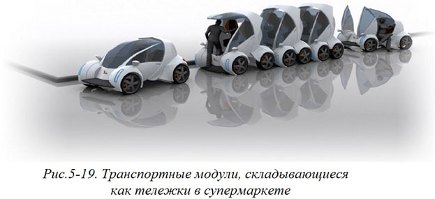 А студенты Массачусетского технологического университета, считая, что главной автопроблемой будущего станут парковки, предложили транспортные устройства, складывающиеся друг с другом как тележки в супермаркете (Рис. 5–19).[5-8]