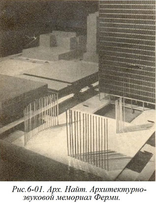 Вот как в то время иронизировал по поводу проекта Найта американский художественный критик Фитч: "Удивительное дело – в этом проекте автор использовал символы, которые невидимы. Ни скульптура, ни живопись, ни даже собственно архитектура мемориальной аудитории не призваны увековечить упомянутого физика. Эта функция должна, по замыслу автора, незримо выполняться группой из 48 колоколов, музыка которых, как отметило жюри, "будет способна проникать в душу гораздо большего количества людей, чем это было бы возможно сделать с помощью только зрительных средств… Эта блестящая идея использования звука как объединяющего принципа создала самый красивый и величественный мемориал, который особенно хорош тем, что он достигает единства Искусства и Науки" (рис. 6–01).