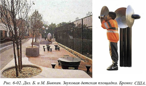 И уже в наше время некоторые архитекторы и дизайнеры стали развивать эту идею дальше. Так, американские дизайнеры Бил и Мери Бьюкен много лет занимаются темой, названной ими «Звучащая архитектура». В 1992–93 гг они создали в Бронксе для школьников маленький звуковой садик, призванный служить одновременно и игровой площадкой, и учебным пособием по вопросам акустики – диффузии и другим свойствам звука (Рис. 6–02).