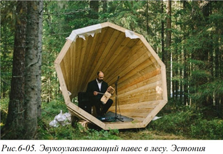 А архитекторы Эстонской Академии Искусств спроектировали комплекс из нескольких объектов, являющихся одновременно и укрытиями для ночевки в лесу, и звуко-усиливающими установками, ловящими и воспроизводящими шелест листьев и щебетание птиц (Рис. 6–05.)