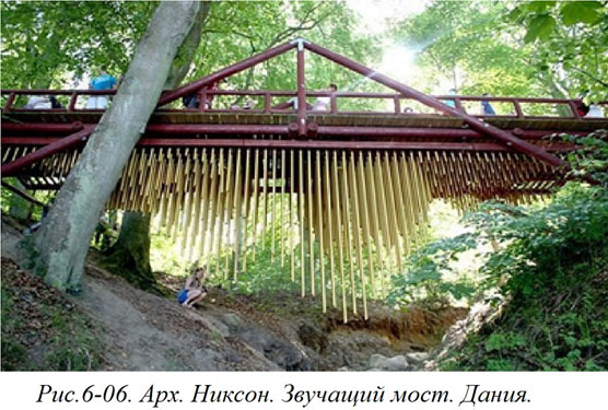 Можно привести еще один пример современной интерпретации Эоловой Арфы. Это созданный архитектором-дизайнером М. Никсоном звучащий мост (Рис. 6–06).