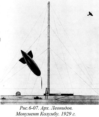 Исходя из подобного убеждения, Леонидов предлагал создать вместо памятника в привычном смысле слова систему информации о том человеке, которого хотят увековечить. Эта система должна была использовать все достижения науки и техники того времени, причем многие из предложенных технических устройств в то время находились в зачаточном состоянии. Радио, "радиоизображения на расстоянии", кино и другие средства техники стали в руках Леонидова средствами архитектурными. Он, например, предлагал во всех крупных городах мира на открытых площадях и в исторических музеях установить специальные экраны, на которые с помощью "радиопередачи изображений" (даже слово «телевидение» еще не получило тогда права гражданства) проецировать историю Колумба (рис. 6–07).