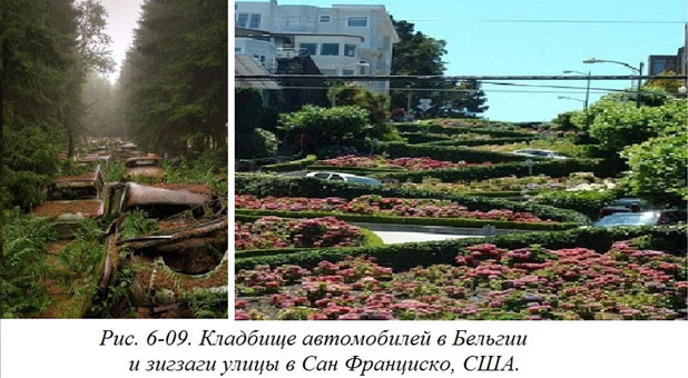 Аналоговое мышление не означает поиск абсолютного сходства и соответственного его использования в своей работе. К примеру, архитектор, видя какой-нибудь объект (даже не обязательно архитектурный, и даже не отдельный объект, а целый фрагмент среды) может воспринимать все это «иносказательно». Например, жилой дом, может воспринимать просто как интересное пластическое решение, которое годится для архитектурного объекта совсем другого назначения, или как интересное цветовое решение, или как интересную фактуру отделки фасада и т. д, и т. п. К примеру, средовой образ «кладбища автомобилей» в Бельгии (Рис. 6–09) вполне мог бы породить замысел необычного решения улицы (точнее средового решения, включающего улицу, автомобили, пешеходов и природы), как это было осуществлено в Сан Франциско. То, что образ этой улицы скорей всего родился у автора как-то иначе, не умаляет ценность аналогового мышления в принципе.