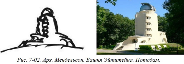 Однако бывают эскизы, изложенные иным, образно говоря, «научно-популярным» языком. И дело не в натуралистической детализации изображения будущего объекта. Эскиз может быть очень обобщенным. Важно, насколько выразителен язык изображения. Сравним эскиз «Башни Эйнштейна» в Потсдаме архитектора Эриха Мендельсона с фотографией построенного объекта. (Рис. 7–02). Рисунок предельно простой, но кажется, что это не эскиз еще не существующего здания, а рисунок с натуры уже построенного архитектурного сооружения.[7-2]