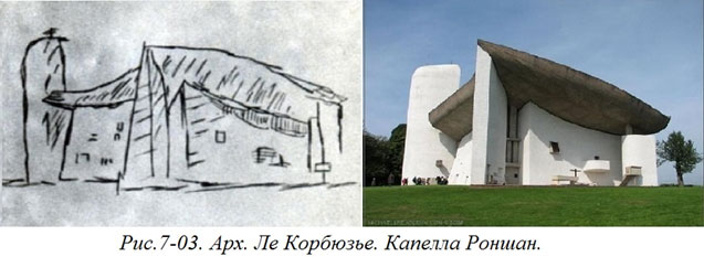 И это не уникальный пример. Крошечный набросок Ле Корбюзье его знаменитой Капеллы Роншан очень образно говорит об облике будущего здания (Рис 7–03).