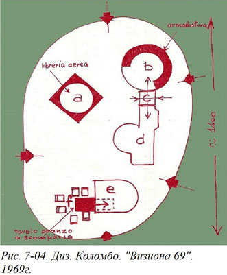 А бывает, что эскиз оказывается в итоге даже более информативным, чем окончательный проект. Наглядный пример – знаменитая «Визиона 69» дизайнера Джо Коломбо. Натурный экспонат безусловно выполнил желание заказчика, максимально наглядно показать потенциальные возможности пластмасс, выпускаемых концерном Байер применительно к мебели и оборудованию жилых интерьеров. Однако для истории дизайна стала более ценной идея, выраженная именно на эскизе. Этот выставочный экспонат изображал жилой интерьер, но не имел ни наружных стен, ни межкомнатных перегородок. И отнюдь не из желания автора обеспечить удобный обзор посетителям выставки. Все дело в том, что Коломбо предложил кардинально новую концепцию организации жилого пространства – «комнаты в комнате», идею, применимую к помещению любой конфигурации. И наиболее наглядно это прочитывалось как раз на рисунке (Рис. 7–04).