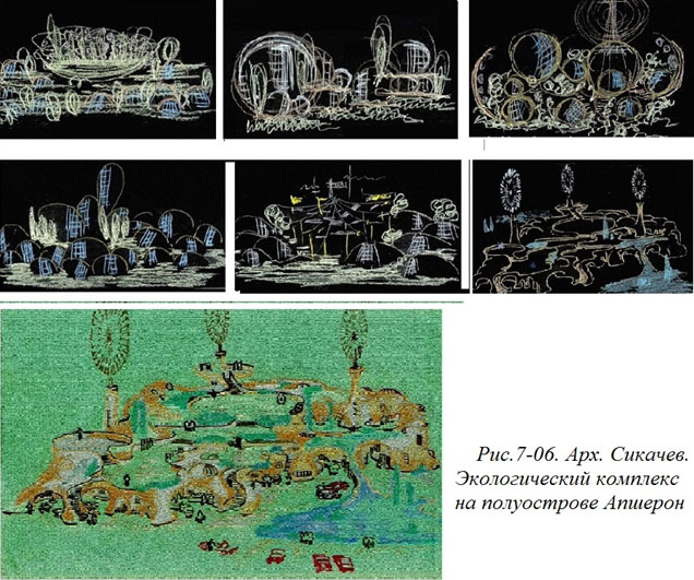 Но однажды произошел инцидент, кардинально изменивший мое отношение к эскизам как важному элементу нашей деятельности. В 1983 году я выполнял эскизное предложение по созданию экологического комплекса на полуострове Апшерон. Экологическая проблематика в архитектуре и дизайне тогда только начиналась и нужны были лишь самые предварительные соображения. Много лет я считал, что проектные материалы безвозвратно утрачены. А когда случайно их обнаружил, они не показались мне заслуживающими внимания. Поскольку никаких дат на рисунках не было, выстроить их в хронологический ряд по памяти было сложно – слишком много времени прошло. Однако сами изображения помогли это сделать без особых трудностей. (Рис. 7–06).
