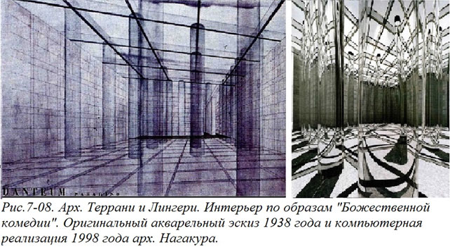 Современные компьютерные технологии открывают новые возможности в решении проблемы сохранения эскизов, ценных для истории культуры. Это иллюстрирует следующий пример. В 1938 году итальянцами Дж. Террани и П. Лингери был разработан эскиз интерьера по образам «Божественной комедии» Проект был представлен в виде акварельных рисунков, в которых авторы пытались показать как стеклянные колонны отражают и направляют свет Солнца в это помещение, символизируя Рай. (Затем на основе этих рисунков был сделан макет.)