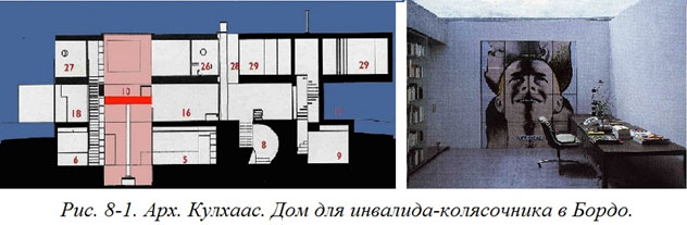 Одной из обязательных характеристик профессиональной архитектурной деятельности является учет специфических характеристик конкретных людей, для которых создается проект. Особо остро данная проблема проявляется в тех случаях, когда потребителем являются инвалиды. В этом отношении очень показателен дом, спроектированный архитектором Кулхаасом. Вначале был заказан довольно обыкновенный дом. Но затем хозяин попал в автокатастрофу и превратился в инвалида-колясочника. И только через два года снова вернулся к мысли о собственном доме. Кулхаас понял, что ситуация качественно изменилась и теперь человек, который в этом доме будет жить, по сути дела стал другим человеком, с другими не только физическими, но и психологическими характеристиками. А это значит, что теперь ему нужен уже совсем другой дом, с другим интерьером. Основным стремлением архитектора стало не просто создание всего лучшего для человека с ограниченными возможностями, а в каком-то смысле отрицание самой инвалидности. Клиент сказал: мне нужен дом, который отражал бы мой мир. И такой дом был построен. Особенно это отразилось на структуре интерьера, основной характерной деталью которого стало особым образом устроенное помещение специально для хозяина-инвалида. Это некоторое подъемное устройство, но не просто большой лифт, удобный для колясочника, а устройство, помогающее инвалиду максимально забыть о своей беде (Рис. 8–01).