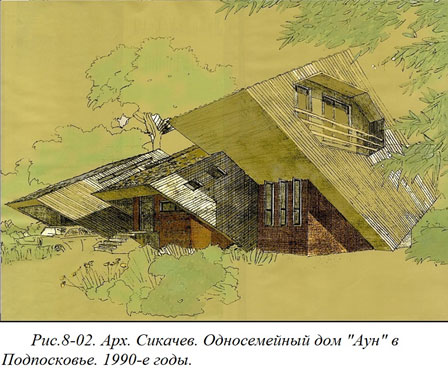 Только-только собрались дом строить, как разразился экономический кризис. Стало не до строительства. Лет через 15 Аун решил продать участок вместе с проектом. Дальнейшую судьбу своего проекта я не знаю. Конечно, архитектору всегда приятно, когда спроектированный им объект воплощается в натуре. Но я ведь спроектировал архитектуру для вполне определенной социальной ситуации, и другому человеку все разумно задуманное мной может оказаться не совсем разумным.