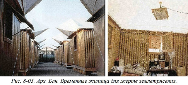 Интересные примеры недолговечного жилища демонстрирует известный японский архитектор Шигеру Бан. Так, по его проекту была возведена небольшая группа временных жилищ для пострадавших после землетрясения (Рис. 8–03). Жилища получились предельно дешевыми. И не случайно – ведь фундаментами служили ящики из-под пива, наполненные песком, а в качестве несущих конструкций использовались трубы, сделанные из переработанных отходов бумаги. (Кстати, эти бумажные трубы – своего рода персональная марка Шигеру Бана. Они использованы во многих других постройках этого архитектора, причем отнюдь не временных). А ограждения он сделал из специальных тентов, что невольно сделало его дома несколько напоминающими походные палатки. К тому же все дома предполагалось впоследствии демонтировать, а все материалы использовать вторично.[8-2]