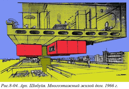 Более решительная трансформация квартир предусматривает изменение размеров жилища. На уровне односемейных домов имеется довольно большое количество проектов, в основном пока еще далеких от реальности. А вот на уровне многоквартирного дома хороший пример – конкурсный проект японского архитектора Шибуйя.[8-3] В его проекте многоэтажный жилой дом представляет собой ряд вертикальных башен с лифтами. Эти вертикали через каждые три уровня соединены между собой открытыми горизонтальными пространствами, своего рода «улицами». Так и напрашивается сказать, что на этих улицах стоят односемейные жилые дома. Однако в этом проекте всё «вверх ногами». Эти домики не НА улице, а ПОД ней. Чтобы войти в квартиру, являющуюся фактически индивидуальным домом, нужно с улицы не подняться по ступенькам (как обычно), а наоборот спуститься на один этаж. На этом уровне автор расположил неизменяемую часть жилищ, включающую то, что принято обозначать термином «общая комната». И уже отсюда можно спуститься еще на этаж, состоящий из индивидуальных комнат в виде висящих объемных блоков (Рис. 8–04).