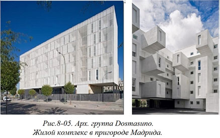 Возможен вариант композиционного построения, если сооружение перевернуть таким образом, что поверхность, к которой крепятся съемные блоки становится одним из фасадов. Именно так поступили испанские архитекторы при проектировании жилого комплекса (Рис. 8–05).