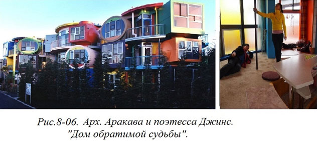 Стремление архитекторов к предельно пристальному отношению к потребителю выглядит вполне понятной. Но иногда архитектурные мутации оказываются столь неожиданными, что не сразу понимаешь их смысл. Когда я впервые увидел публикацию о доме, спроектированном архитектором С. Аракава и поэтессой М. Джинс, он показался мне нелепостью, бессмысленностью. Это дом, в котором всё сделано преднамеренно неудобно. Не случайно, что много лет авторы не могли найти покупателя своей архитектурной диковинки. Я тоже поначалу счел это неким архитектурным эпатажем, отложил информацию об этом объекте в раздел своего архива, озаглавленный «архитектурные курьезы» и, на какое-то время забыл о нем.