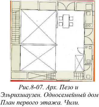 Архитектурные мутации хороши еще и тем, что предлагают принципиально новые подходы там, где, казалось бы ничего нового придумать невозможно. Каждому архитектору понятно, что, скажем, наружные стены существуют в основном для того, чтобы защитить интерьер сооружения и находящихся в нем людей от непогоды, врагов и других неблагоприятных факторов. И вдруг чилийские архитекторы М. Пезо и С. Фон Эльрихшаузен, проектируя односемейный жилой дом добавляют наружным стенам еще одну функцию – быть вместилищем некоторых помещений жилища (Рис. 8–07).