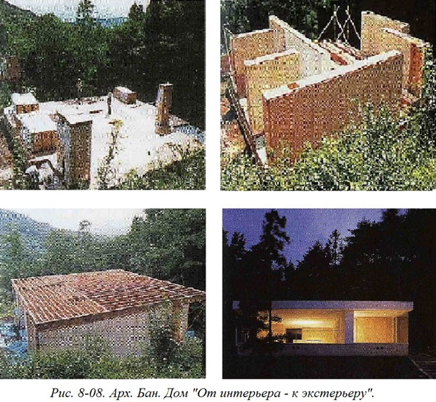Нестандартная идея обнародована, мутация налицо, продукт явно образного, аналогового мышления. И вот теперь уже можно включать цифровое мышление, брать в помощники компьютеры и создавать много самых разных (многие из которых окажутся более совершенными, чем исходный образец) архитектурных вариантов. Оказывается, что в самом, казалось, простом архитектурном объекте потенциально содержится неисчерпаемое море смыслов, способных стать идеями для сотворения мутаций. Уже упоминавшийся мной японский архитектор Шигеру Бан предложил еще одно совершенно неожиданное архитектурное решение. Мы всегда считали само собой разумеющимся, что сначала возводится здание и лишь после этого оно наполняется оборудованием и мебелью. То есть сначала экстерьер, и только потом интерьер. А Бан осмелился эту формулу перевернуть вверх ногами. Он организовал строительный процесс в обратном порядке. (Рис. 8–08).
