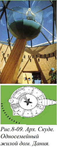 В 1990 году архитектор Ф. Скуде спроектировал односемейный жилой дом, в котором, предусмотрел помещение, которому вообще нет пока еще названия. Это центральная круглая комната, вокруг которой скомпонованы все остальные комнаты – кухня, столовая, спальни и т. п. (Рис. 8–09). В центре этого помещения установлен необычный объект, являющийся одновременно и архитектурным, и дизайнерским. Именно этот объект и является основной «изюминкой» эксперимента. Внутри него сделана лестница, ведущая на специально оборудованную площадку под самой стеклянной крышей. Дело в том, что у хозяев дома есть довольно необычная психологическая особенность – они любят общаться днем с облачным небом, а ночью – со звездами, со Вселенной. И архитектор спроектировал дом адресно с учетом психологии, причем психологические требования определили характер интерьера в большей степени, чем чисто функциональные.