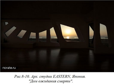 Заказчик не был ни очень старым, ни безнадежно больным человеком. Можно лишь с уверенностью утверждать, что подобная просьба исходила из глубинных основ японской философии, в которой отсутствует страх перед смертью и которая рассматривает смерть всего лишь как естественный переход в нечто иное. Архитекторам понадобился немалый срок и немалые усилия нестандартно мыслить, чтобы попытаться осознать пожелания клиента и воплотить в жизнь все чаяния и надежды в ЕГО Доме Ожидания Смерти (Рис. 8–10).