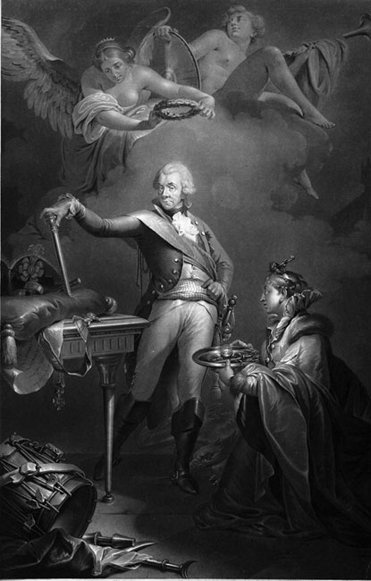 Суворов стоит возле стола с трофеями окружении аллегорических фигур. 1800