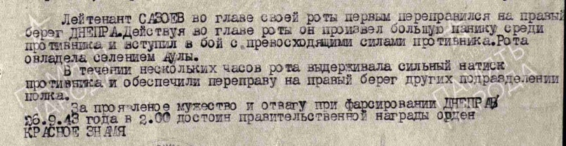 Для справки: Лейтенант Сазоев Николай Заморзочив (Заморзович Дзамора – по разным документам) форсировал Днепр 26.09 в 2-00, награжден орденом Красного Знамени (Приказ № 036/н от 01.10.43 г. [d40]) посмертно.