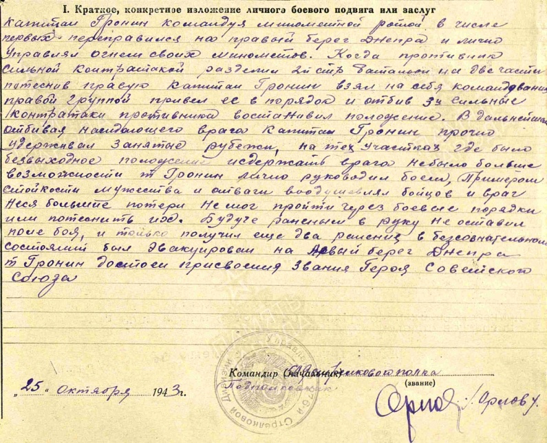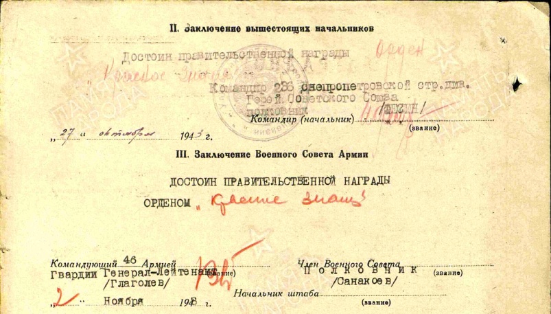 В наградном листе отмечено, что рота под его командованием форсировала Днепр 26.09 в 02–00 и обеспечила переправу других подразделений полка: