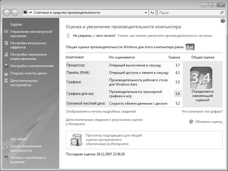Для начала перейдите по ссылке Показать подробности в правой верхней части окна. В результате откроется окно, показанное на рис. 1.1. Здесь можно увидеть общую оценку системы, то есть тот самый индекс производительности. В нашем случае он составляет 3,4.