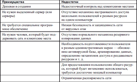 Таблица 2.1. Преимущества и недостатки одноранговой сети
