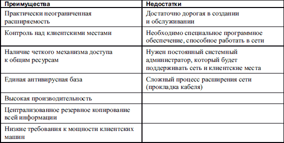 Таблица 2.2. Преимущества и недостатки сети на основе сервера
