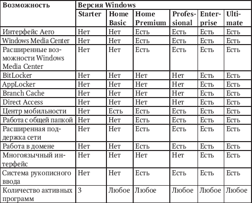 Таблица 1.1. Список функциональных ограничений для разных версий Windows 7