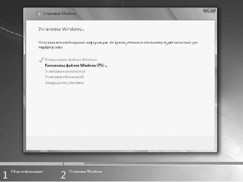 После перезагрузки компьютера установка операционной системы продолжится. При этом программа установки обновит параметры реестра (рис. 4.10), выполнит инициализацию и запуск системных служб, необходимых для дальнейшего продолжения процесса установки, и т. д.