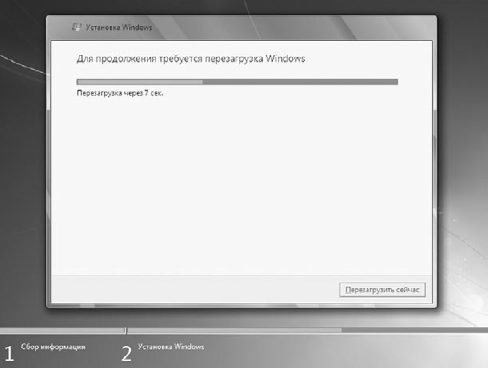 Когда закончится установка обновлений, программа потребует перезагрузки компьютера (рис. 4.9). Чтобы сэкономить еще несколько секунд, можете ускорить перезагрузку компьютера, нажав кнопку Перезагрузить сейчас. Если время для вас не играет важной роли, просто ничего не делайте – программа установки все выполнит сама.