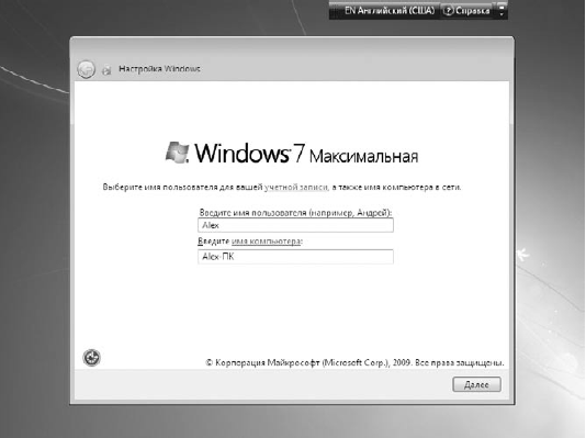 Первым делом нужно будет ввести имя вашей учетной записи и имя компьютера (рис. 4.12). В принципе, можно указать любые названия, но лучше задать что-то, что однозначно вас идентифицирует. Особенно это важно, если вы планируете подключать компьютер к сети. Поверьте, ваш компьютер гораздо легче смогут найти ваши друзья в сети, если вы введете что-то типа Showman вместо XX8 9 0EEN55 67-4 5eA7BC.