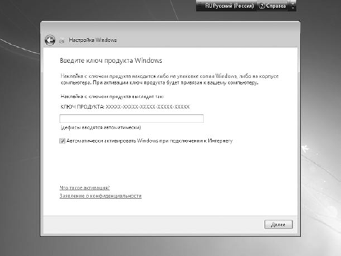 Далее необходимо ввести ключ, который подтверждает вашу лицензию на право использования этой версии операционной системы (рис. 4.14). В принципе, ключ можно и не вводить на данном этапе, если вы не можете его найти или у вас его вообще нет. В этом случае вам нужно будет на протяжении 30 дней с момента первого запуска операционной системы указать этот ключ. А иначе система заблокируется и не даст вам возможности попасть в свою или любую другую учетную запись.