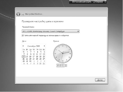 После этого вам нужно будет указать часовой пояс, в котором вы находитесь (рис. 4.16). Сделать это достаточно просто: откройте список и, используя полосу прокрутки, выберите из него часовой пояс, подходящий для вашего города. Затем проверьте, правильно ли указаны дата и текущее время, и при необходимости подкорректируйте их.